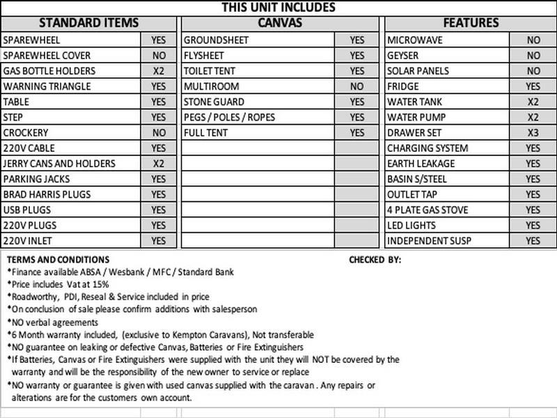 The OUTBOUND is a beast of a trailer with loads of features. Twin stainless steel water tanks with twin pumps, a slide out stainless steel basin with side by side 4 plate gas stove, duel shock with coil spring independent suspension and a slide out fridge 4 bertth Kempton Caravans is a Multi Franchise dealer with 38 years industry experience, we are proud suppliers of major brands that include Quantum, Echo, Stealth, Vagabond, Tuffcats and Invader. Kempton Caravans & Leisure World offers you new and used caravans, trailers, tents, camping equipment, caravan accessories, outdoor gadgets and gear for sale. Kempton Caravans & Leisure World in Edenvale Gauteng offers you repairs, servicing, modifications and customisations to your caravan, trailer or tent in our workshop. |